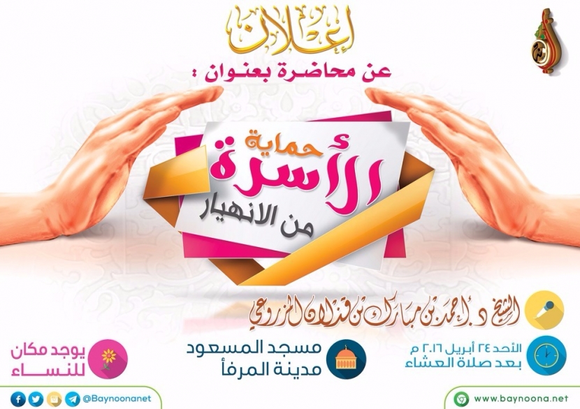 محاضرة: حماية الأسرة من الانهيار تاريخ الإضافة: الثلاثاء, 26/04/2016 - 13:04 التصنيفات الشيخ: د. أحمد بن مبارك المزروعي