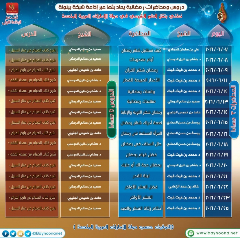دروس ومحاضرات رمضانية يعاد بثها عبر إذاعة شبكة بينونة تاريخ الإضافة: الجمعة, 03/06/2016 - 01:47 التصنيفات الشيخ: مجموعة من المشايخ