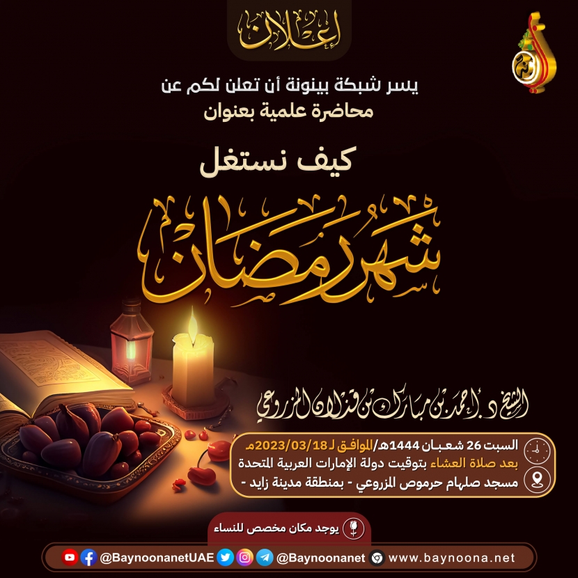 محاضرة علمية بعنوان: كيف نستغل شهر رمضان تاريخ الإضافة: الإثنين, 13/03/2023 - 23:48 التصنيفات الشيخ: د. أحمد بن مبارك المزروعي