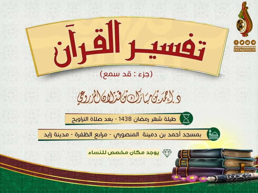 تفسير القرآن (جزء قد سمع) تاريخ الإضافة: الثلاثاء, 06/06/2017 - 14:23 التصنيفات الشيخ: د. أحمد بن مبارك المزروعي