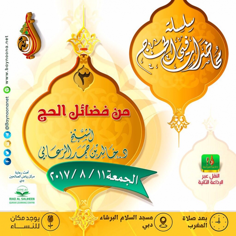 محاضرة بعنوان: من فضائل الحج تاريخ الإضافة: الجمعة, 11/08/2017 - 11:10 التصنيفات الشيخ: د. خالد بن حمد الزعابي