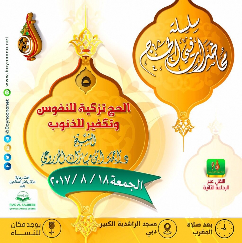 محاضرة بعنوان: الحج تزكية للنفوس وتكفير للذنوب تاريخ الإضافة: الجمعة, 18/08/2017 - 08:53 التصنيفات الشيخ: د. أحمد بن مبارك المزروعي
