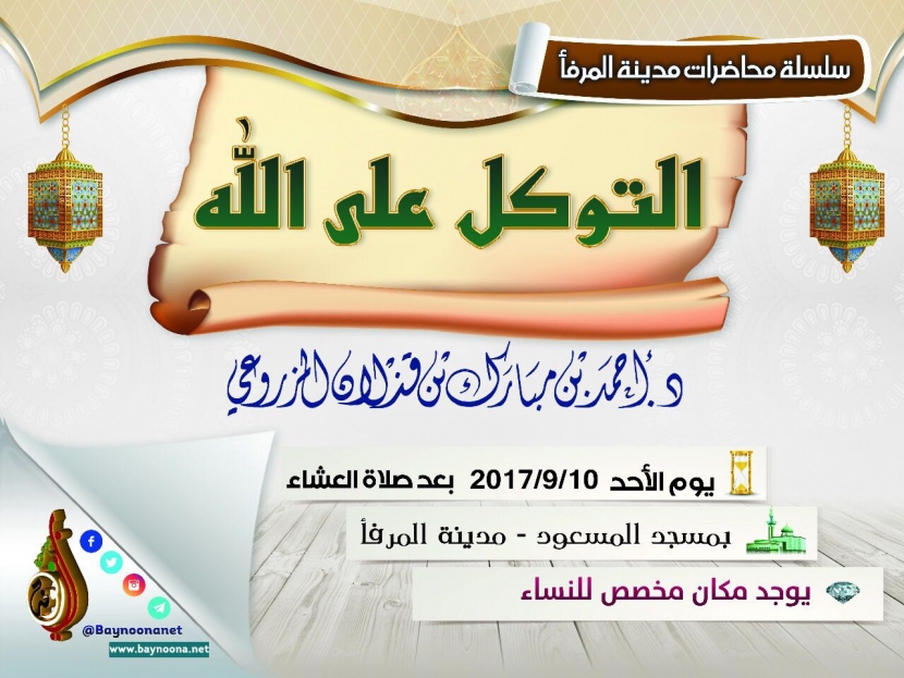 محاضرة بعنوان: التوكل على الله تاريخ الإضافة: الأحد, 10/09/2017 - 11:39 التصنيفات الشيخ: د. أحمد بن مبارك المزروعي