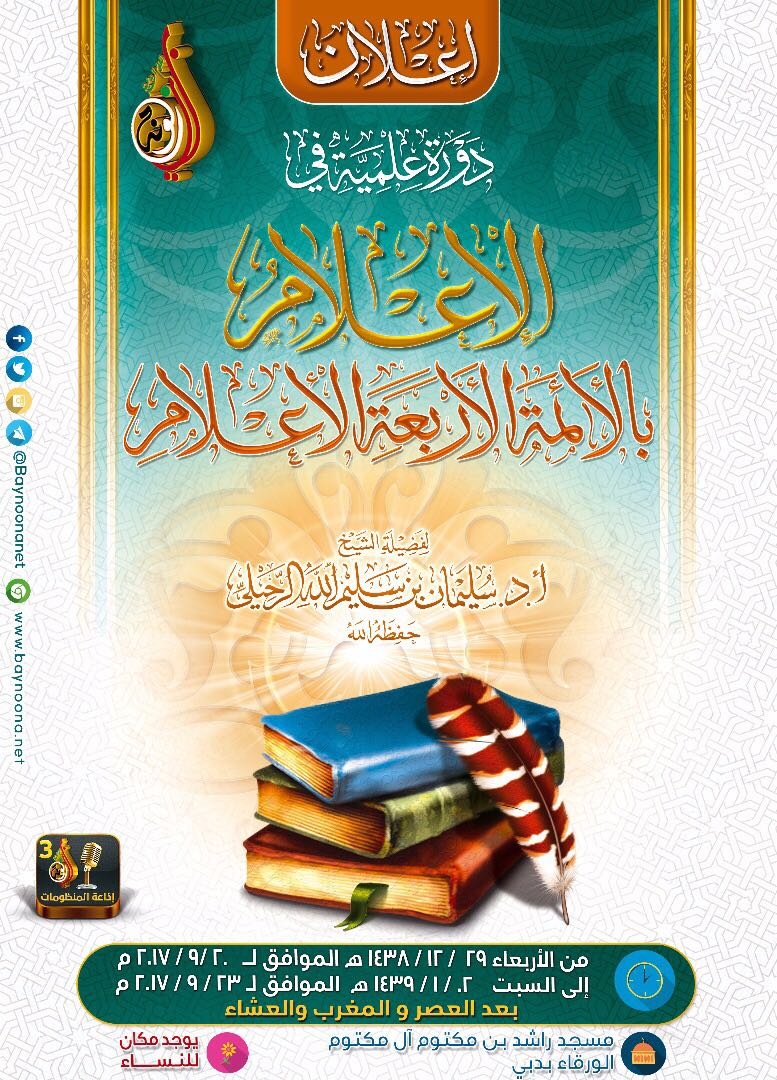 دورة علمية في الإعلام بالأئمة الأربعة الأعلام تاريخ الإضافة: الأربعاء, 13/09/2017 - 22:39 التصنيفات الشيخ: سليمان بن سليم الله الرحيلي