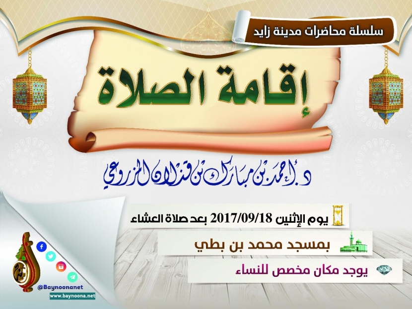 محاضرة بعنوان: إقامة الصلاة تاريخ الإضافة: الإثنين, 18/09/2017 - 11:29 التصنيفات الشيخ: د. أحمد بن مبارك المزروعي