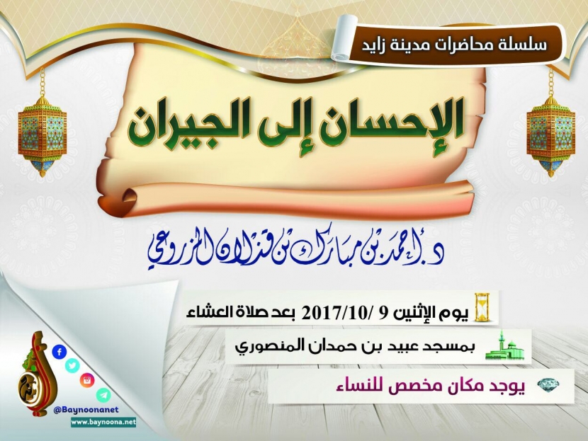 محاضرة بعنوان: الإحسـان إلى الجيران تاريخ الإضافة: الإثنين, 09/10/2017 - 11:43 التصنيفات الشيخ: د. أحمد بن مبارك المزروعي