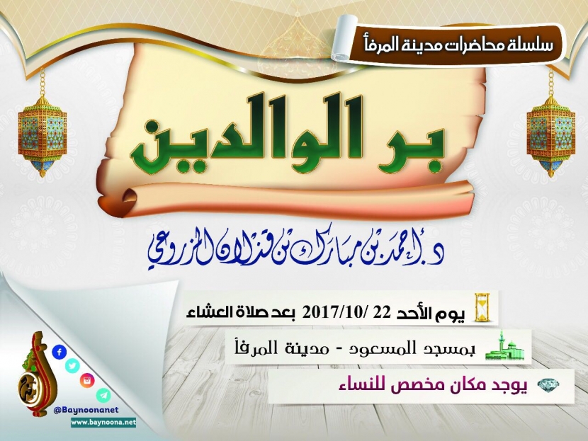 محاضرة بعنوان: بر الوالدين تاريخ الإضافة: الأحد, 22/10/2017 - 11:23 التصنيفات الشيخ: د. أحمد بن مبارك المزروعي