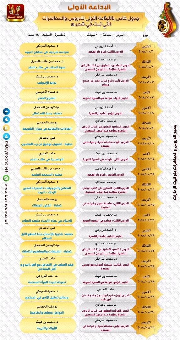 جدول الدروس المسجلة التي ستبث عبر الإذاعة الرئيسية ( لشهر 01 / 2018 م) تاريخ الإضافة: الخميس, 28/12/2017 - 01:33 التصنيفات الشيخ: مجموعة من المشايخ