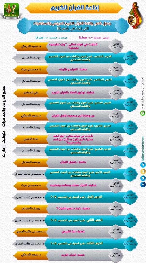 جدول الدروس المسجلة التي ستبث عبر إذاعة القرآن الكريم ( لشهر 01 / 2018 م) تاريخ الإضافة: الخميس, 28/12/2017 - 01:35 التصنيفات الشيخ: مجموعة من المشايخ