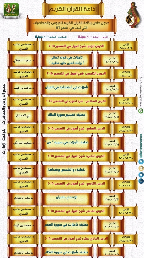 جدول الدروس المسجلة التي ستبث عبر إذاعة القرآن الكريم ( لشهر 02 / 2018 م) تاريخ الإضافة: الخميس, 01/02/2018 - 00:43 التصنيفات الشيخ: مجموعة من المشايخ