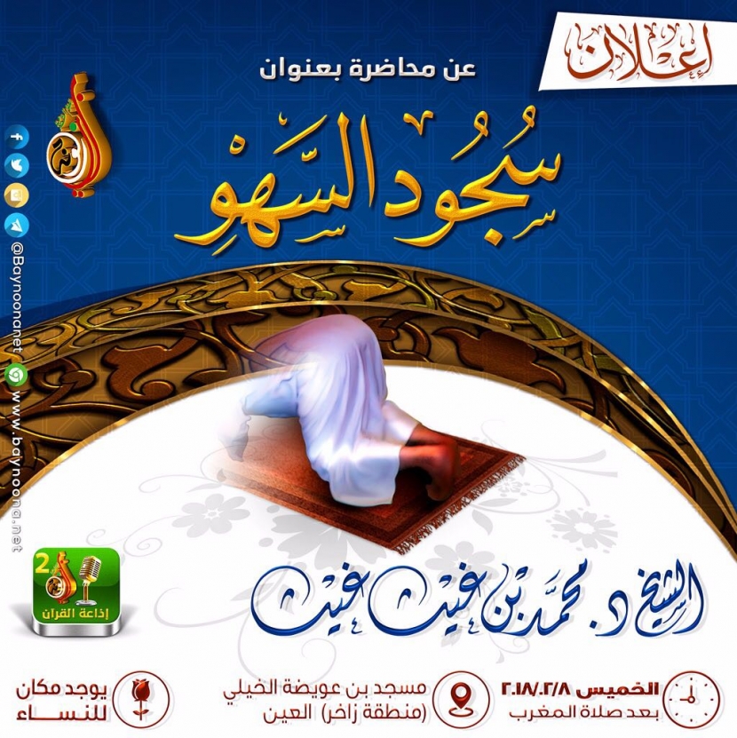محاضرة بعنوان: سجود السهو تاريخ الإضافة: الخميس, 08/02/2018 - 13:42 التصنيفات الشيخ: د. محمد بن غيث غيث