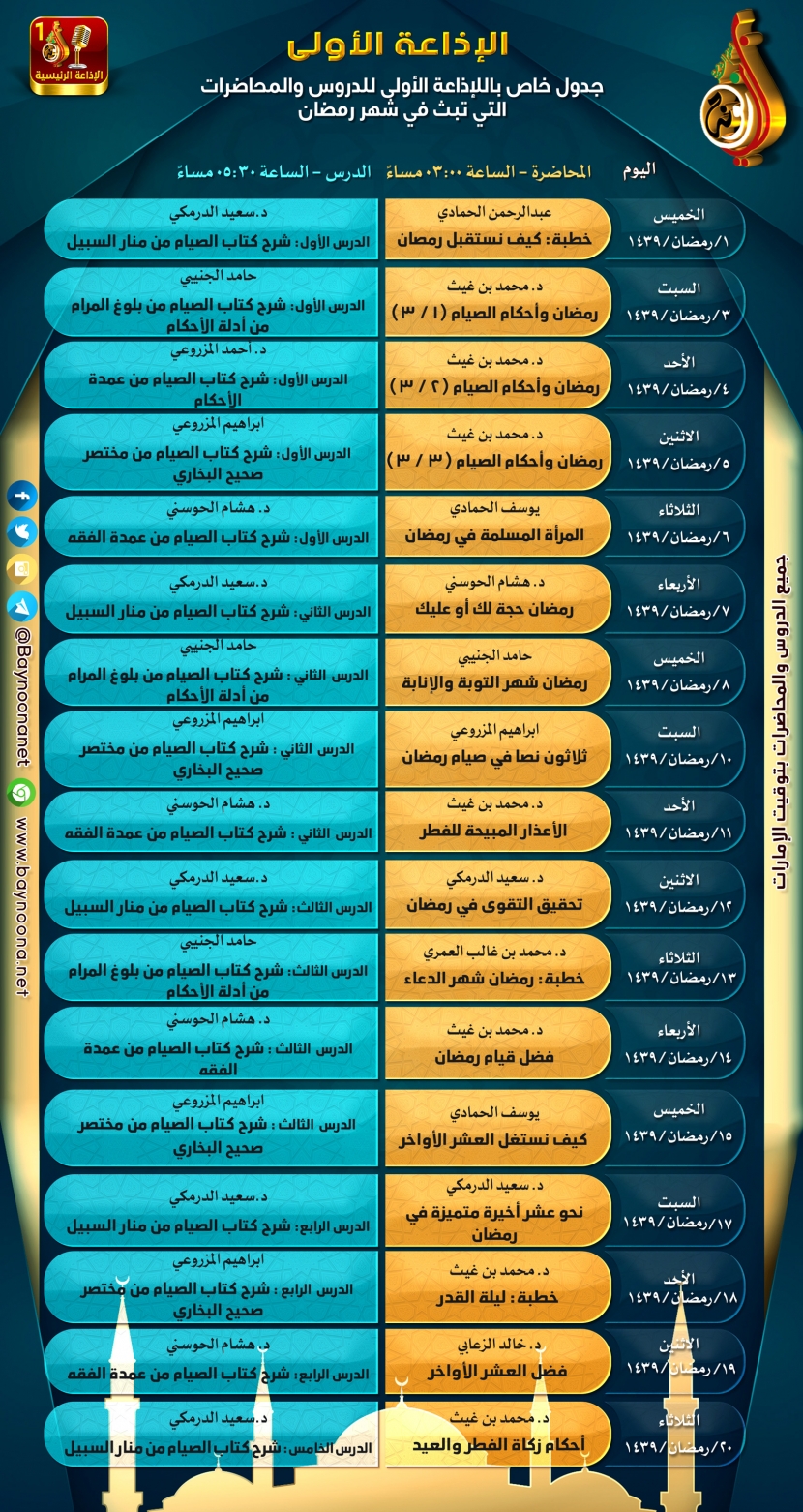 جدول الدروس المسجلة التي ستبث عبر الإذاعة الرئيسية ( لشهر رمضان ١٤٣٩ هـ) تاريخ الإضافة: الأربعاء, 16/05/2018 - 14:12 التصنيفات الشيخ: مجموعة من المشايخ