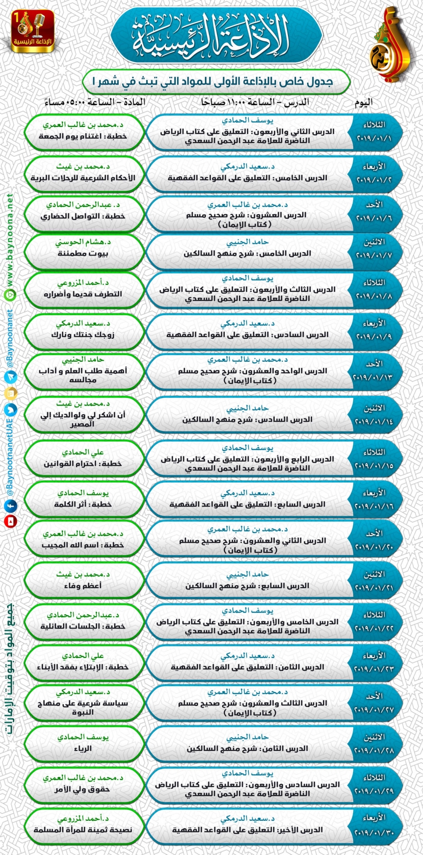 جدول الدروس المسجلة التي ستبث عبر الإذاعة الرئيسية ( لشهر 1 / 2019 م) تاريخ الإضافة: السبت, 29/12/2018 - 17:23 التصنيفات الشيخ: مجموعة من المشايخ