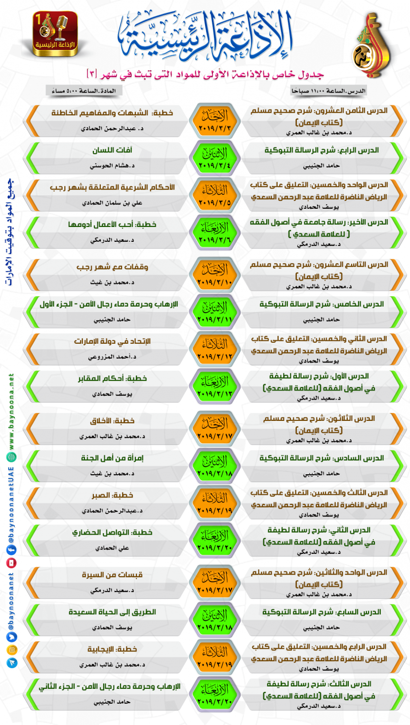 جدول الدروس المسجلة التي ستبث عبر الإذاعة الرئيسية ( لشهر 3 / 2019 م) تاريخ الإضافة: الخميس, 28/02/2019 - 09:54 التصنيفات الشيخ: مجموعة من المشايخ