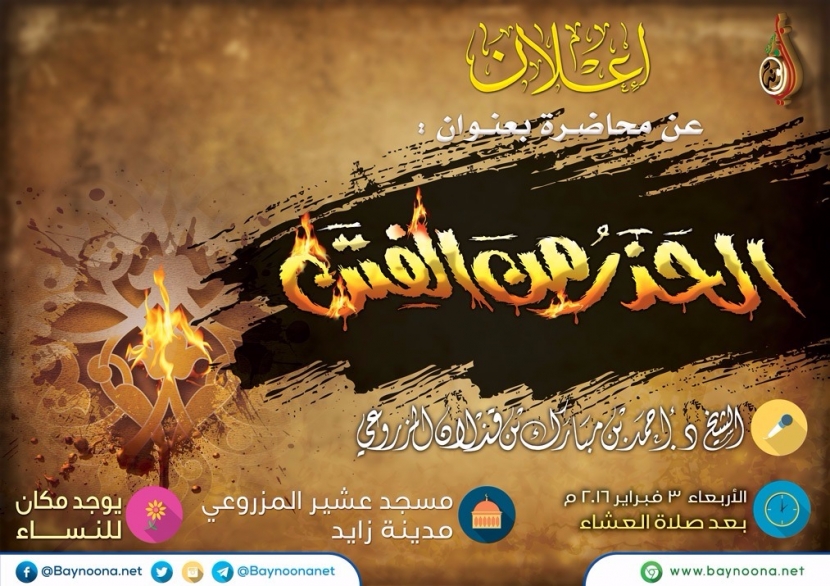 محاضرة: الحذر من الفتن تاريخ الإضافة: الأربعاء, 03/02/2016 - 18:19 التصنيفات الشيخ: د. أحمد بن مبارك المزروعي