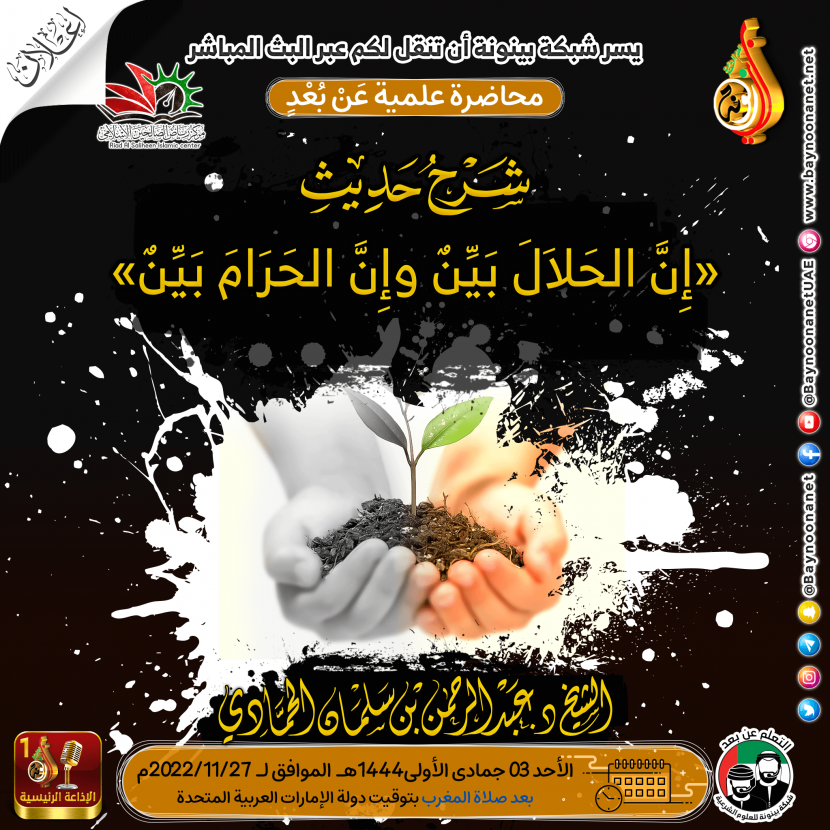 محاضرة علمية عن بعد بعنوان: شرح حديث ( إن الحلال بين وإن الحرام بين ) تاريخ الإضافة: الخميس, 24/11/2022 - 22:38 التصنيفات الشيخ: د. سعيد بن سالم الدرمكي