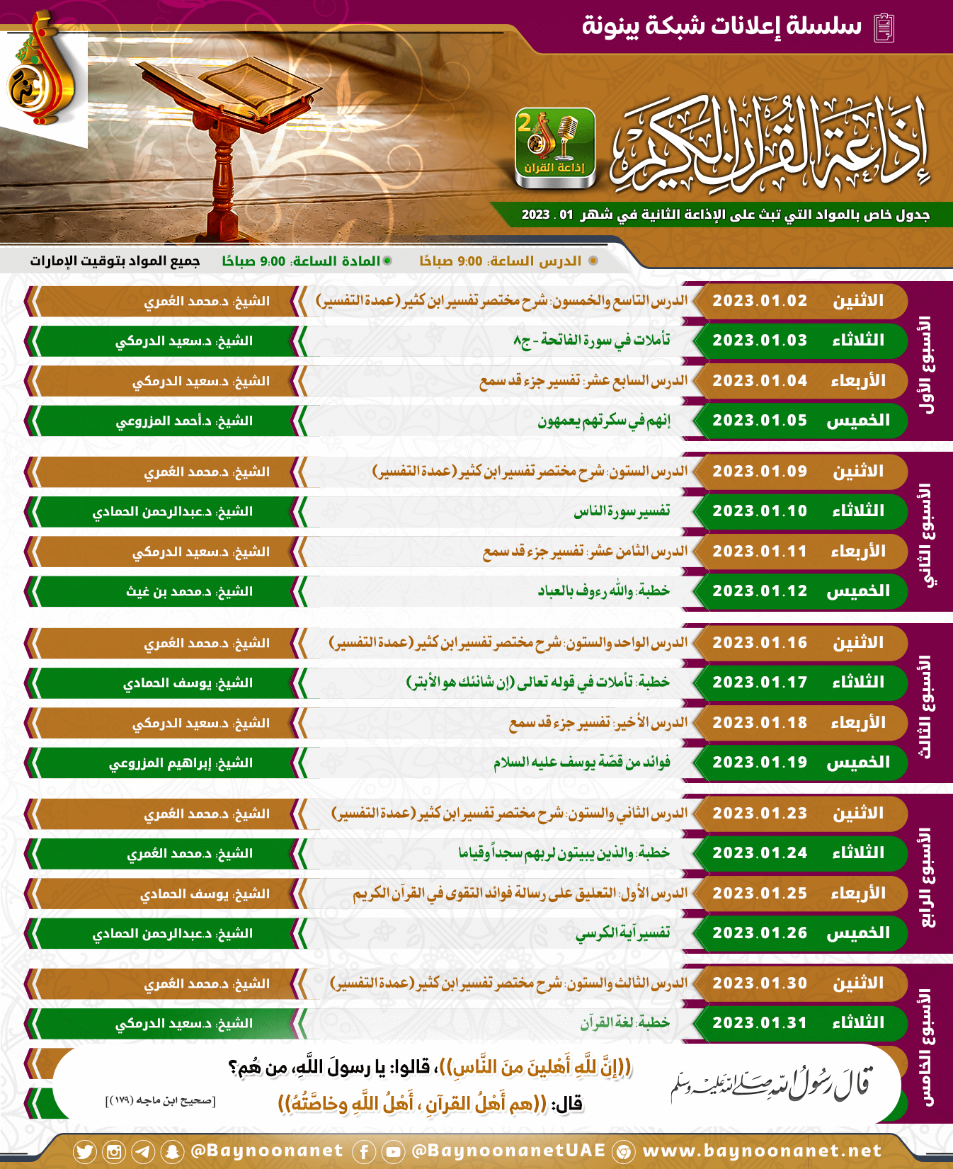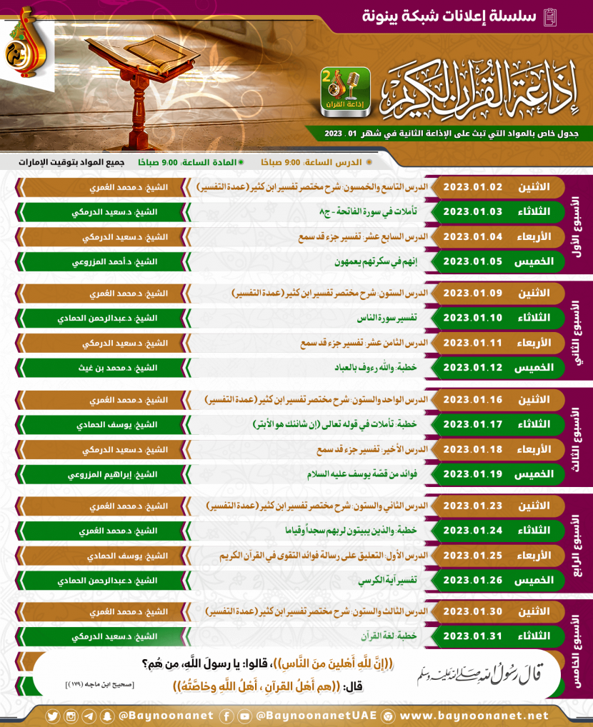 جدول الدروس المسجلة التي ستبث عبر إذاعة القرآن الكريم ( لشهر 01 / 2023 م ) تاريخ الإضافة: السبت, 31/12/2022 - 14:24 التصنيفات الشيخ: مجموعة من المشايخ
