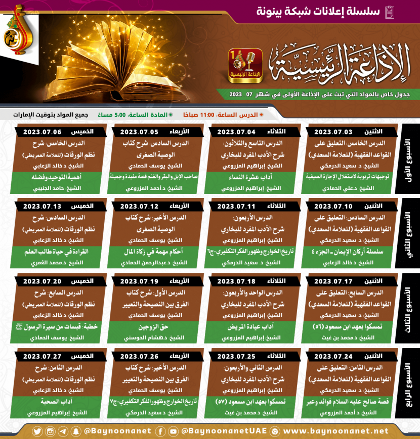 جدول الدروس المسجلة التي ستبث عبر الإذاعة الرئيسية ( لشهر 07 / 2023 م ) تاريخ الإضافة: الأحد, 02/07/2023 - 14:04 التصنيفات الشيخ: مجموعة من المشايخ