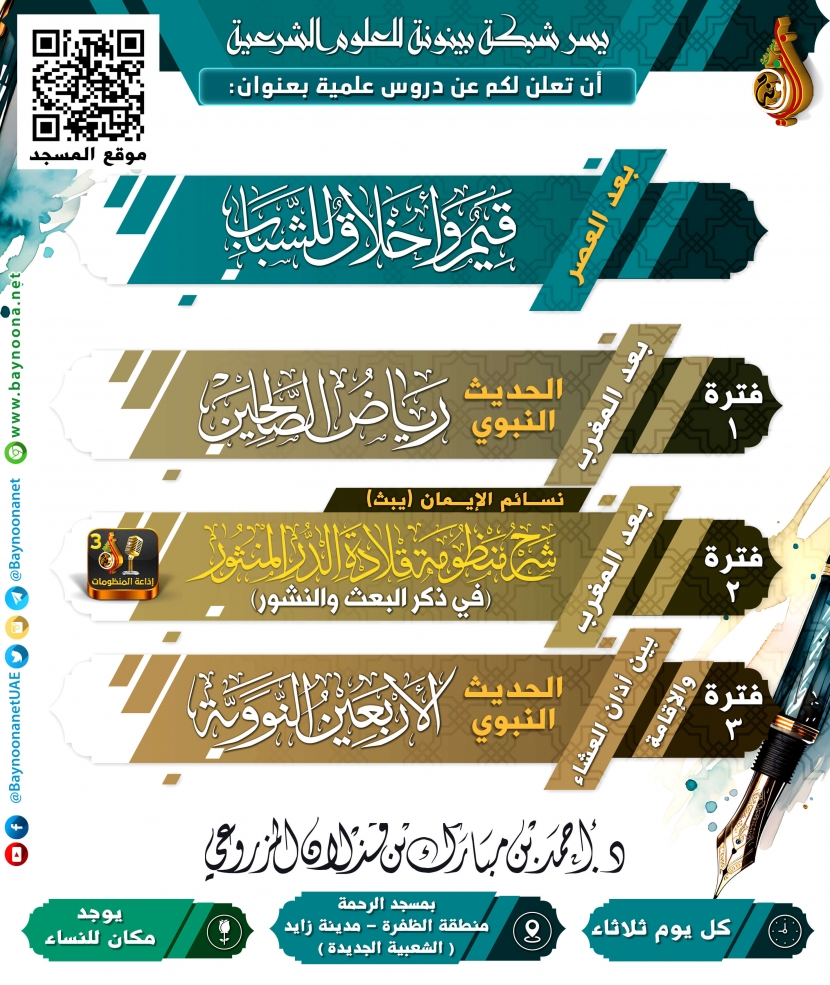 دروس الشيخ د. أحمد بن مبارك المزروعي ليوم الثلاثاء تاريخ الإضافة: الإثنين, 04/12/2023 - 21:18 التصنيفات الشيخ: د. أحمد بن مبارك المزروعي