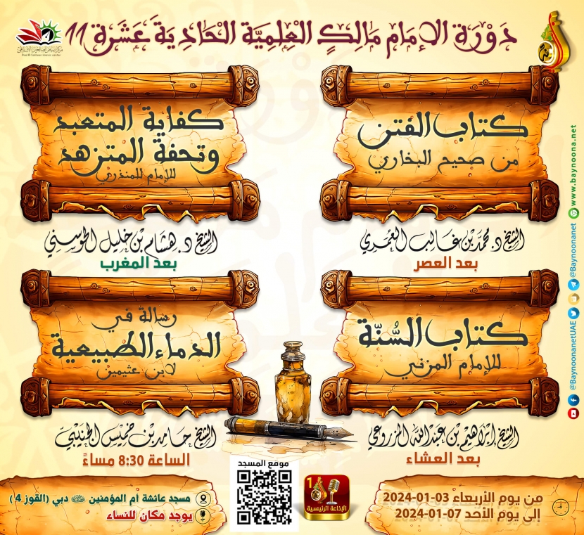 دورة الإمام مالك العلمية الحادية عشرة، بدبي ( 03 - 07 / 01 / 2024 ) تاريخ الإضافة: الإثنين, 25/12/2023 - 21:35 التصنيفات الشيخ: من إعداد شبكة بينونة