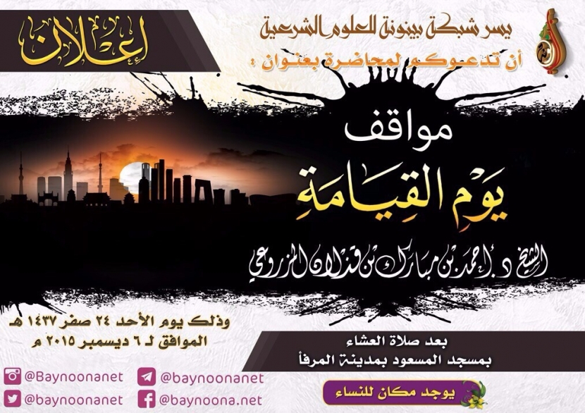 محاضرة: مواقف يوم القيامة تاريخ الإضافة: الأحد, 06/12/2015 - 18:06 التصنيفات الشيخ: د. أحمد بن مبارك المزروعي