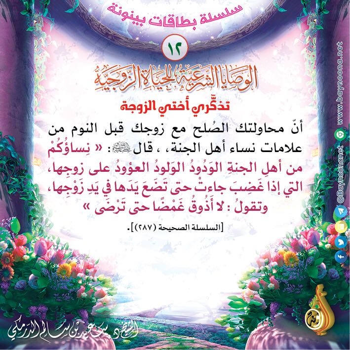 الوصايا الشرعية للحياة الزوجية (12) تاريخ الإضافة: الأحد, 18/03/2018 - 22:09 التصنيفات صنف البطاقة: ركن الأسرة سلسلة بطاقات: الوصايا الشرعية للحياة الزوجية حمل السلسلة كاملة: الوصايا الشرعية للحياة الزوجية