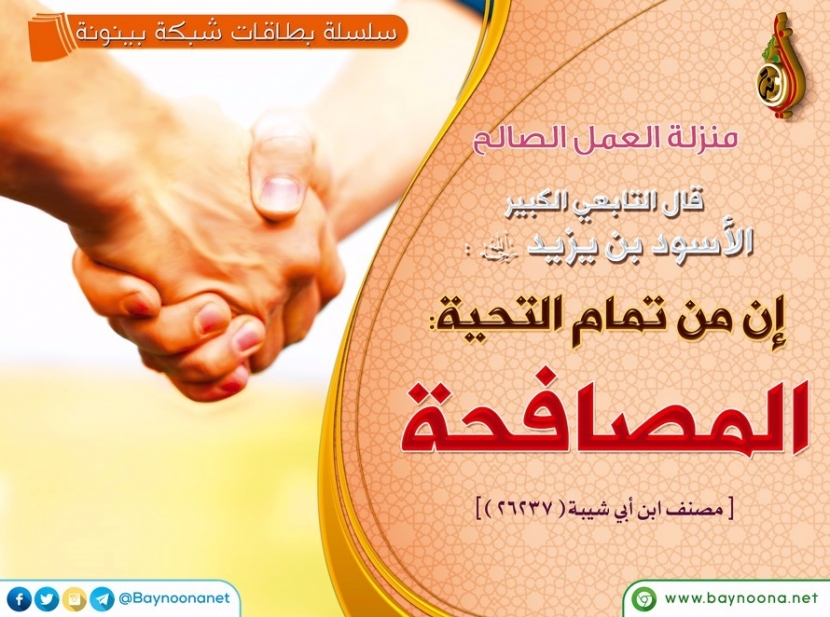 منزلة العمل الصالح تاريخ الإضافة: الأربعاء, 30/03/2016 - 21:00 التصنيفات صنف البطاقة: الأخلاق والآداب قال التابعي الكبير الأسود بن يزيد -رحمه الله-: "إن من تمام التحية المصافحة" [مصنف ابن أبي شيبة (26237)]