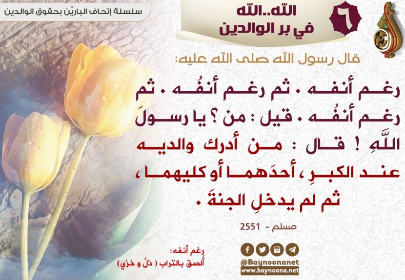 إتحاف الباريّن بحقوق الوالدين - (6) الله .. الله في بر الوالدين تاريخ الإضافة: الخميس, 05/04/2018 - 11:18 التصنيفات صنف البطاقة: الأخلاق والآداب صنف البطاقة: بر الوالدين سلسلة بطاقات: إتحاف البارين بحقوق الوالدين حمل السلسلة كاملة: إتحاف البارين بحقوق الوالدين