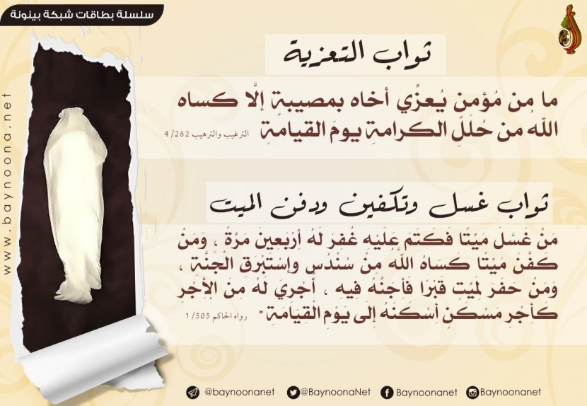 "ما من مسلم يعزي أخاه بمصيبة إلى كساه الله من حلل الكرمة يوم القيامة" [الترغيب والترهيب: 262 / 4]