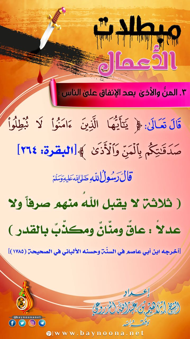 مبطلات الأعمال - (3) المن والأذى بعد الإنفاق على الناس تاريخ الإضافة: الأحد, 24/06/2018 - 11:09 التصنيفات صنف البطاقة: إيمانيات صنف البطاقة: الأخلاق والآداب الشيخ: إبراهيم بن عبد الله المزروعي سلسلة بطاقات: مبطلات الأعمال حمل السلسلة كاملة: مبطلات الأعمال
