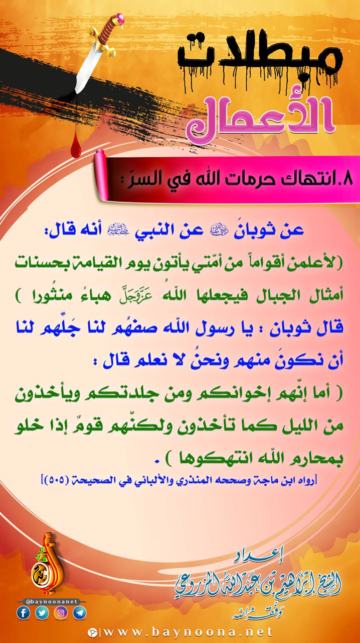 مبطلات الأعمال - (8) انتهاك حرمات الله في السر تاريخ الإضافة: السبت, 30/06/2018 - 11:09 التصنيفات صنف البطاقة: إيمانيات الشيخ: إبراهيم بن عبد الله المزروعي سلسلة بطاقات: مبطلات الأعمال حمل السلسلة كاملة: مبطلات الأعمال