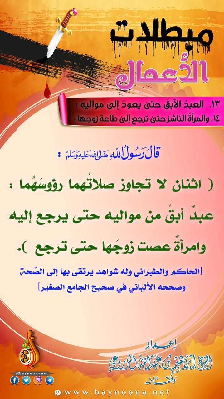 مبطلات الأعمال - (13 ، 14) العبد الأبق حتى يعود إلى مواليه، والمرأة الناشز حتى ترجع إلى طاعة زوجها تاريخ الإضافة: الخميس, 05/07/2018 - 11:21 التصنيفات صنف البطاقة: إيمانيات الشيخ: إبراهيم بن عبد الله المزروعي سلسلة بطاقات: مبطلات الأعمال حمل السلسلة كاملة: مبطلات الأعمال