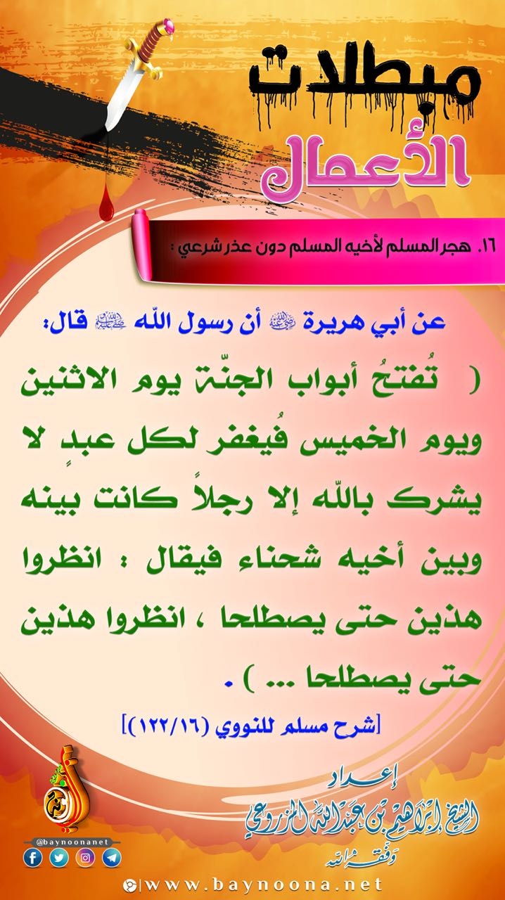 مبطلات الأعمال - (16) هجر المسلم لأخيه المسلم دون عذر شرعي تاريخ الإضافة: الأحد, 08/07/2018 - 11:32 التصنيفات صنف البطاقة: إيمانيات الشيخ: إبراهيم بن عبد الله المزروعي سلسلة بطاقات: مبطلات الأعمال حمل السلسلة كاملة: مبطلات الأعمال