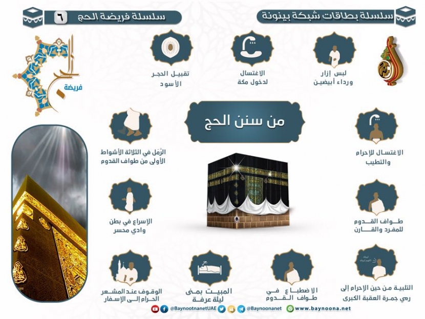 فريضة الحج - (6) من سنن الحج تاريخ الإضافة: السبت, 21/07/2018 - 15:09 التصنيفات صنف البطاقة: الحج والعمرة الشيخ: من إعداد شبكة بينونة سلسلة بطاقات: فريضة الحج حمل السلسلة كاملة: فريضة الحج