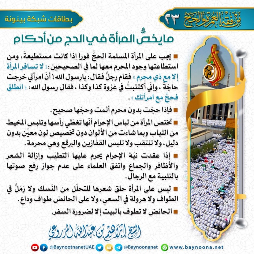 من فقه العمرة والحج - (23) ما يخص المرأة في الحج من أحكام تاريخ الإضافة: الأربعاء, 08/08/2018 - 14:22 التصنيفات صنف البطاقة: الحج والعمرة الشيخ: إبراهيم بن عبد الله المزروعي سلسلة بطاقات: من فقه العمرة والحج حمل السلسلة كاملة: من فقه العمرة والحج
