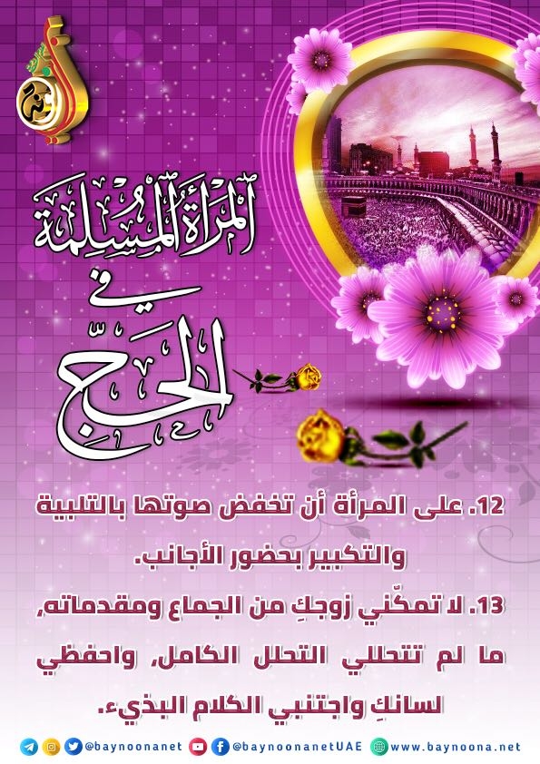المرأة المسلمة في الحج - (12 ، 13) على المرأة أن تخفض صوتها بالتلبية والتكبير بحضور الأجانب... ، لا تمكني زوجك من الجماع ومقدماته... تاريخ الإضافة: السبت, 18/08/2018 - 13:49 التصنيفات صنف البطاقة: الحج والعمرة الشيخ: من إعداد شبكة بينونة سلسلة بطاقات: المرأة المسلمة في الحج حمل السلسلة كاملة: المرأة المسلمة في الحج