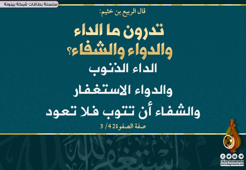 تدرون ما الداء والدواء والشفاء؟... تاريخ الإضافة: الإثنين, 27/08/2018 - 16:08 التصنيفات صنف البطاقة: إيمانيات الشيخ: من إعداد شبكة بينونة