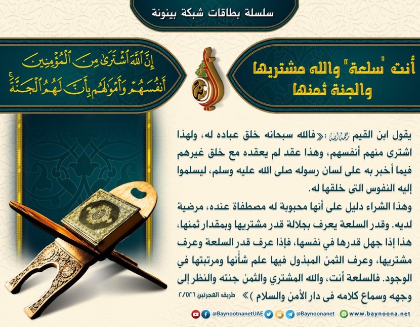 أنت "سلعة" والله مشتريها والجنة ثمنها تاريخ الإضافة: الثلاثاء, 18/12/2018 - 12:39 التصنيفات صنف البطاقة: إيمانيات الشيخ: من إعداد شبكة بينونة