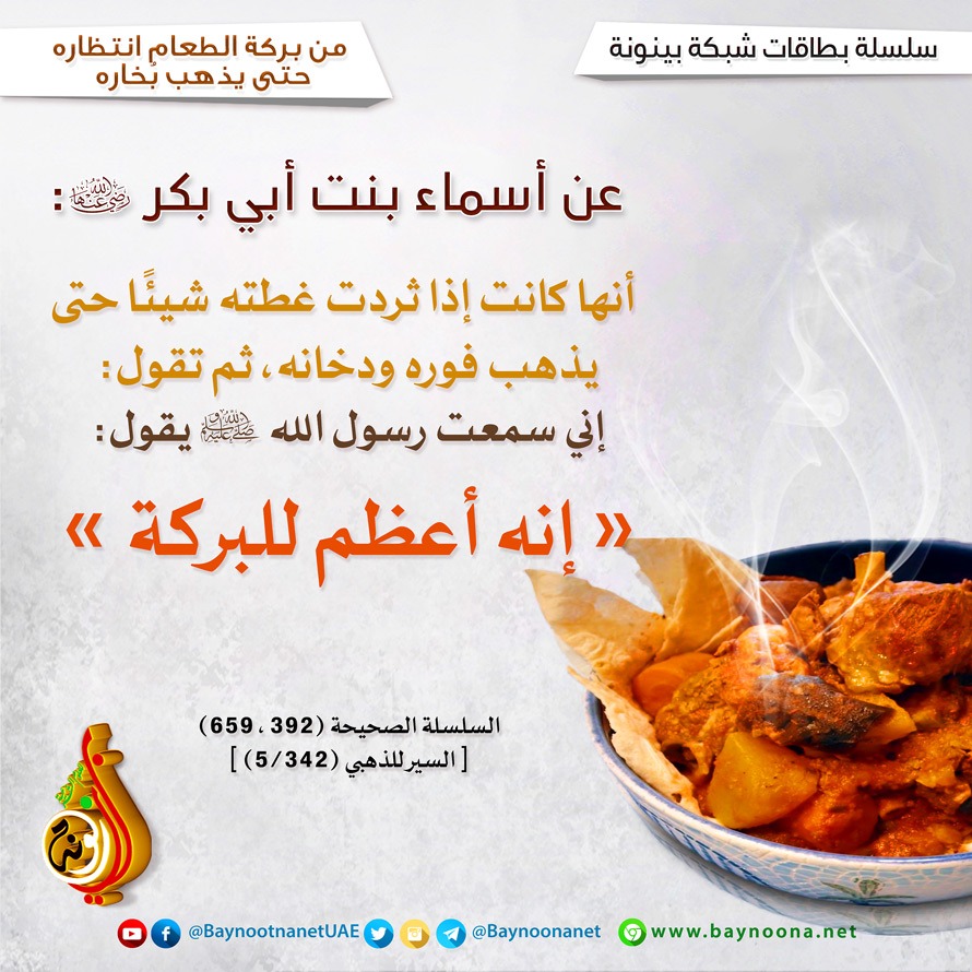 من بركة الطعام انتظاره حتى يذهب بخاره تاريخ الإضافة: الأربعاء, 30/01/2019 - 14:45 التصنيفات صنف البطاقة: الأخلاق والآداب الشيخ: من إعداد شبكة بينونة