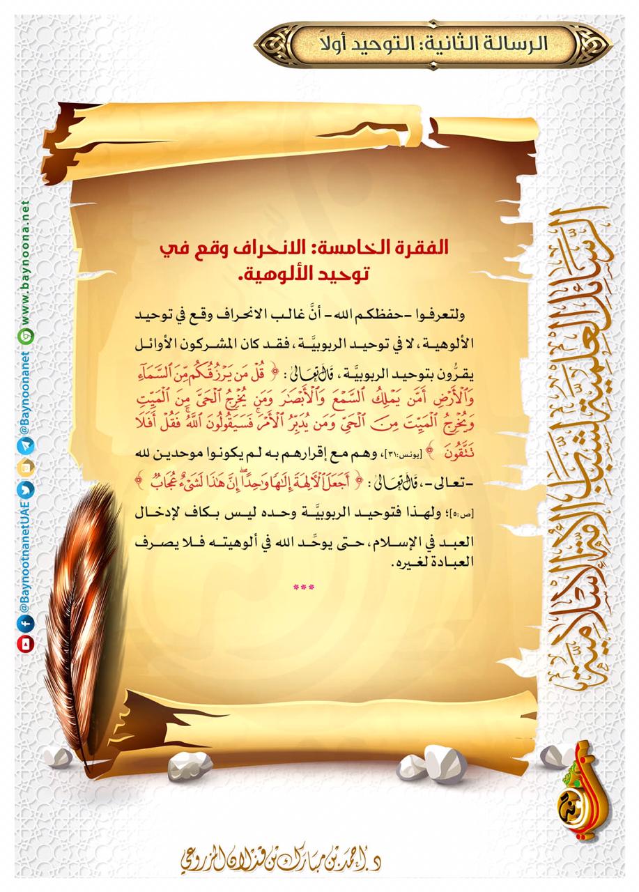 الرسائل العلمية لشباب الأمة الإسلامية - الرسالة الثانية: التوحيد أولاً - الفقرة (5): الانحراف وقع في توحيد الألوهية تاريخ الإضافة: الأحد, 03/02/2019 - 11:22 التصنيفات صنف البطاقة: إيمانيات الشيخ: د. أحمد بن مبارك المزروعي سلسلة بطاقات: الرسائل العلمية لشباب الأمة الإسلامية حمل السلسلة كاملة: الرسائل العلمية لشباب الأمة الإسلامية - الرسالة الأولى: عقيدتي نجاتي حمل السلسلة كاملة: الرسائل العلمية لشباب الأمة الإسلامية - الرسالة الثانية: التوحيد أولاً حمل السلسلة كاملة: الرسائل العلمية لشباب الأمة الإسلامية - الرسالة الثالثة: هذه أخلاقي حمل السلسلة كاملة: الرسائل العلمية لشباب الأمة الإسلامية - الرسالة الرابعة: أهم أحداث السيرة النبوية حمل السلسلة كاملة: الرسائل العلمية لشباب الأمة الإسلامية - الرسالة الخامسة: العشرة المبشرون بالجنة حمل السلسلة كاملة: الرسائل العلمية لشباب الأمة الإسلامية - الرسالة السادسة: علموا الشباب قبل أن يتخطفهم الإرهاب حمل السلسلة كاملة: الرسائل العلمية لشباب الأمة الإسلامية - الرسالة السابعة: أصول مهمة لشباب الأمة حمل السلسلة كاملة: الرسائل العلمية لشباب الأمة الإسلامية - الرسالة الثامنة: صفة الوضوء والصلاة لشباب الإسلام حمل السلسلة كاملة: الرسائل العلمية لشباب الأمة الإسلامية حمل السلسلة كاملة: الرسائل العلمية لشباب الأمة الإسلامية - الرسالة التاسعة: أنا الفتاة المسلمة