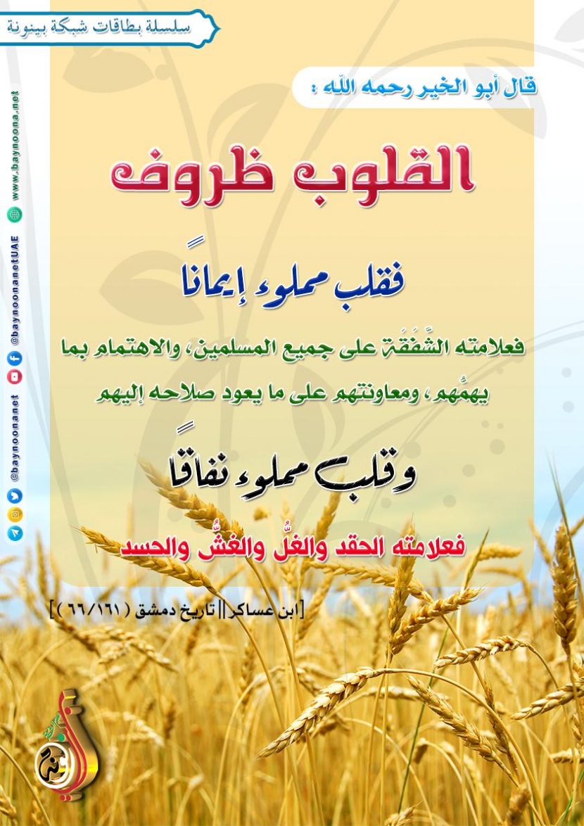 القلوب ظروف تاريخ الإضافة: الثلاثاء, 05/02/2019 - 13:13 التصنيفات صنف البطاقة: إيمانيات الشيخ: من إعداد شبكة بينونة