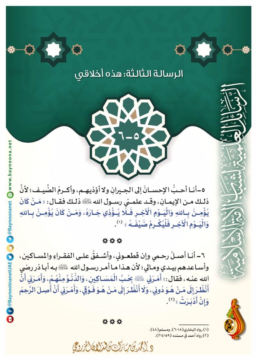 الرسائل العلمية لشباب الأمة الإسلامية - الرسالة الثالثة: هذه أخلاقي (5 ، 6) تاريخ الإضافة: السبت, 16/02/2019 - 11:50 التصنيفات صنف البطاقة: الأخلاق والآداب الشيخ: د. أحمد بن مبارك المزروعي سلسلة بطاقات: الرسائل العلمية لشباب الأمة الإسلامية حمل السلسلة كاملة: الرسائل العلمية لشباب الأمة الإسلامية - الرسالة الأولى: عقيدتي نجاتي حمل السلسلة كاملة: الرسائل العلمية لشباب الأمة الإسلامية - الرسالة الثانية: التوحيد أولاً حمل السلسلة كاملة: الرسائل العلمية لشباب الأمة الإسلامية - الرسالة الثالثة: هذه أخلاقي حمل السلسلة كاملة: الرسائل العلمية لشباب الأمة الإسلامية - الرسالة الرابعة: أهم أحداث السيرة النبوية حمل السلسلة كاملة: الرسائل العلمية لشباب الأمة الإسلامية - الرسالة الخامسة: العشرة المبشرون بالجنة حمل السلسلة كاملة: الرسائل العلمية لشباب الأمة الإسلامية - الرسالة السادسة: علموا الشباب قبل أن يتخطفهم الإرهاب حمل السلسلة كاملة: الرسائل العلمية لشباب الأمة الإسلامية - الرسالة السابعة: أصول مهمة لشباب الأمة حمل السلسلة كاملة: الرسائل العلمية لشباب الأمة الإسلامية - الرسالة الثامنة: صفة الوضوء والصلاة لشباب الإسلام حمل السلسلة كاملة: الرسائل العلمية لشباب الأمة الإسلامية حمل السلسلة كاملة: الرسائل العلمية لشباب الأمة الإسلامية - الرسالة التاسعة: أنا الفتاة المسلمة