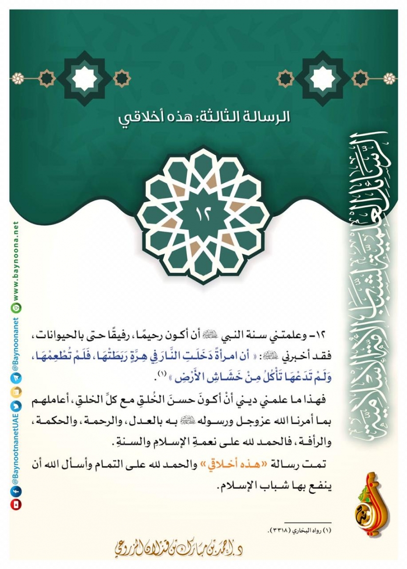 الرسائل العلمية لشباب الأمة الإسلامية - الرسالة الثالثة: هذه أخلاقي (12) تاريخ الإضافة: الخميس, 21/02/2019 - 17:38 التصنيفات صنف البطاقة: الأخلاق والآداب الشيخ: د. أحمد بن مبارك المزروعي سلسلة بطاقات: الرسائل العلمية لشباب الأمة الإسلامية حمل السلسلة كاملة: الرسائل العلمية لشباب الأمة الإسلامية - الرسالة الأولى: عقيدتي نجاتي حمل السلسلة كاملة: الرسائل العلمية لشباب الأمة الإسلامية - الرسالة الثانية: التوحيد أولاً حمل السلسلة كاملة: الرسائل العلمية لشباب الأمة الإسلامية - الرسالة الثالثة: هذه أخلاقي حمل السلسلة كاملة: الرسائل العلمية لشباب الأمة الإسلامية - الرسالة الرابعة: أهم أحداث السيرة النبوية حمل السلسلة كاملة: الرسائل العلمية لشباب الأمة الإسلامية - الرسالة الخامسة: العشرة المبشرون بالجنة حمل السلسلة كاملة: الرسائل العلمية لشباب الأمة الإسلامية - الرسالة السادسة: علموا الشباب قبل أن يتخطفهم الإرهاب حمل السلسلة كاملة: الرسائل العلمية لشباب الأمة الإسلامية - الرسالة السابعة: أصول مهمة لشباب الأمة حمل السلسلة كاملة: الرسائل العلمية لشباب الأمة الإسلامية - الرسالة الثامنة: صفة الوضوء والصلاة لشباب الإسلام حمل السلسلة كاملة: الرسائل العلمية لشباب الأمة الإسلامية حمل السلسلة كاملة: الرسائل العلمية لشباب الأمة الإسلامية - الرسالة التاسعة: أنا الفتاة المسلمة