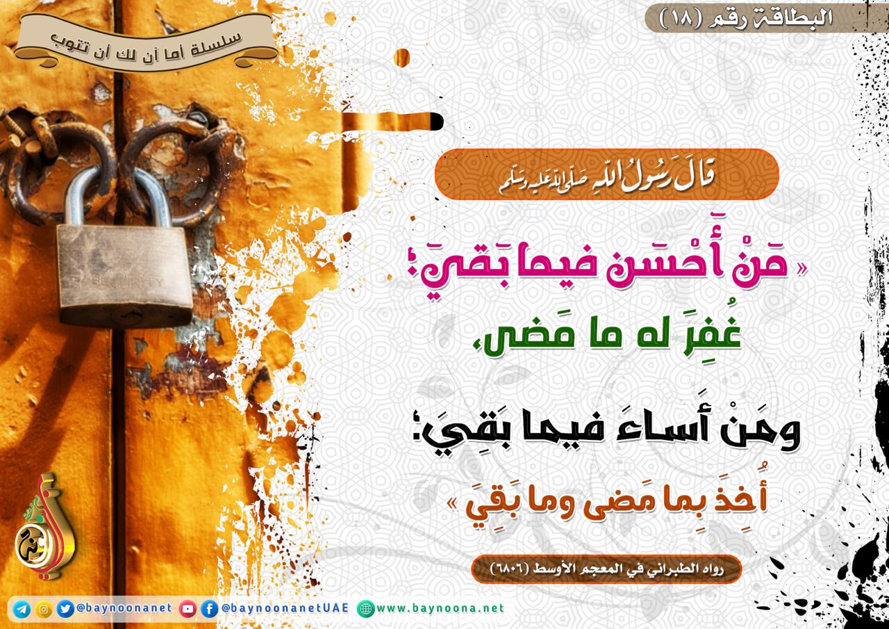 أما آن لك أن تتوب - (18) قال ﷺ: من أحسن يما بقي، غفر له ما مضى... تاريخ الإضافة: الأربعاء, 20/03/2019 - 15:37 التصنيفات صنف البطاقة: إيمانيات صنف البطاقة: التحذير من المعاصي الشيخ: من إعداد شبكة بينونة سلسلة بطاقات: أما آن لك أن تتوب حمل السلسلة كاملة: أما آن لك أن تتوب