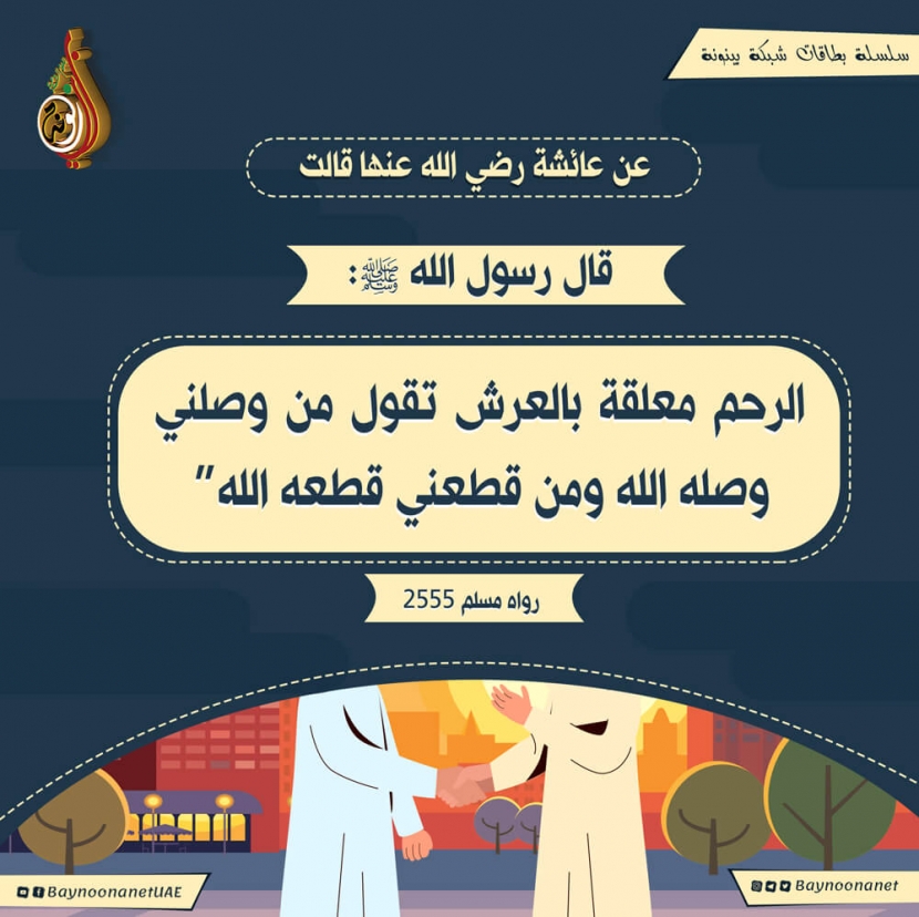 قال ﷺ: (الرحم معلقة بالعرش تقول من وصلني وصله الله ومن قطعني قطعه الله) تاريخ الإضافة: الثلاثاء, 03/12/2019 - 14:44 التصنيفات صنف البطاقة: إيمانيات صنف البطاقة: الأخلاق والآداب الشيخ: من إعداد شبكة بينونة