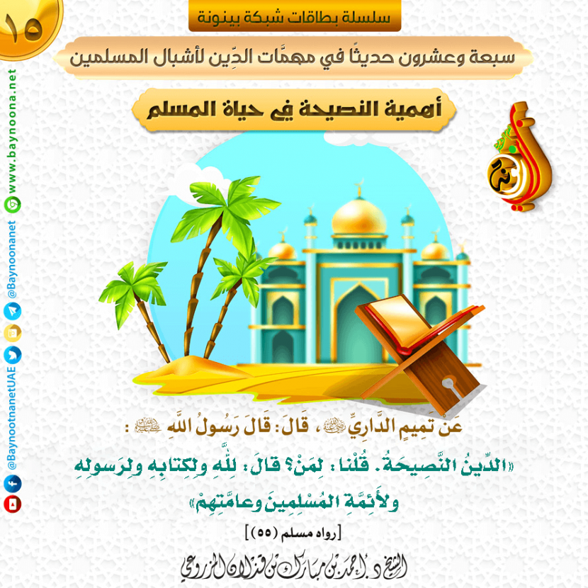 سبعة وعشرون حديثا في مهمات الدين لأشبال المسلمين - (١٥) أهمية النصيحة في حياة المسلم تاريخ الإضافة: السبت, 07/12/2019 - 21:00 التصنيفات صنف البطاقة: إيمانيات صنف البطاقة: الأخلاق والآداب الشيخ: د. أحمد بن مبارك المزروعي سلسلة بطاقات: سبعة وعشرون حديثا في مهمات الدين لأشبال المسلمين حمل السلسلة كاملة: سبعة وعشرون حديثا في مهمات الدين لأشبال المسلمين