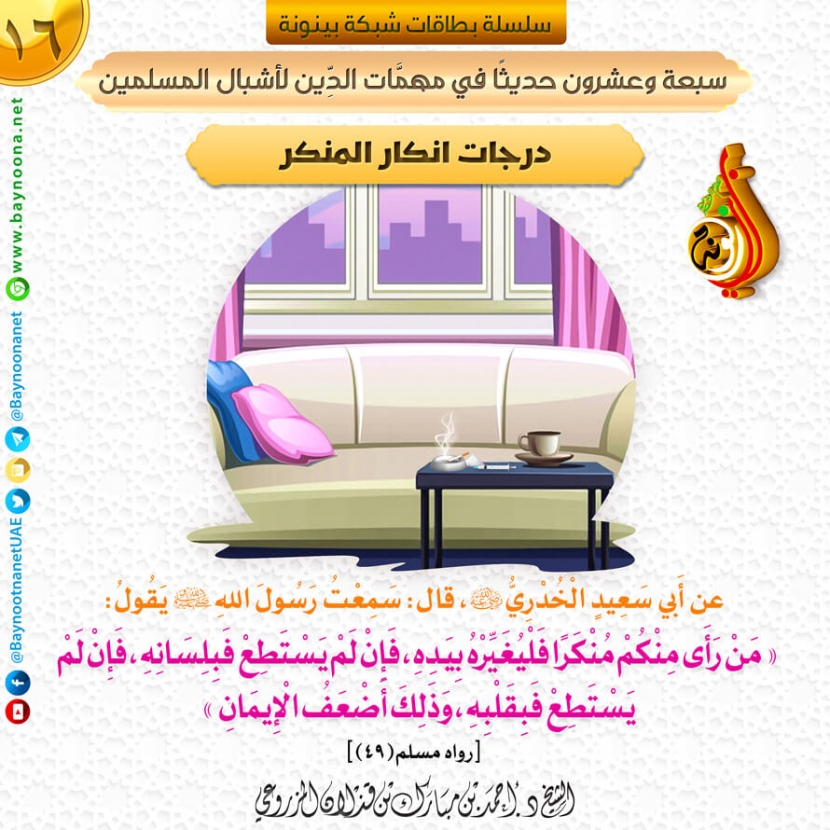 سبعة وعشرون حديثا في مهمات الدين لأشبال المسلمين - (١٦) درجات إنكار المنكر تاريخ الإضافة: الأحد, 08/12/2019 - 13:25 التصنيفات صنف البطاقة: إيمانيات صنف البطاقة: الأخلاق والآداب الشيخ: د. أحمد بن مبارك المزروعي سلسلة بطاقات: سبعة وعشرون حديثا في مهمات الدين لأشبال المسلمين حمل السلسلة كاملة: سبعة وعشرون حديثا في مهمات الدين لأشبال المسلمين