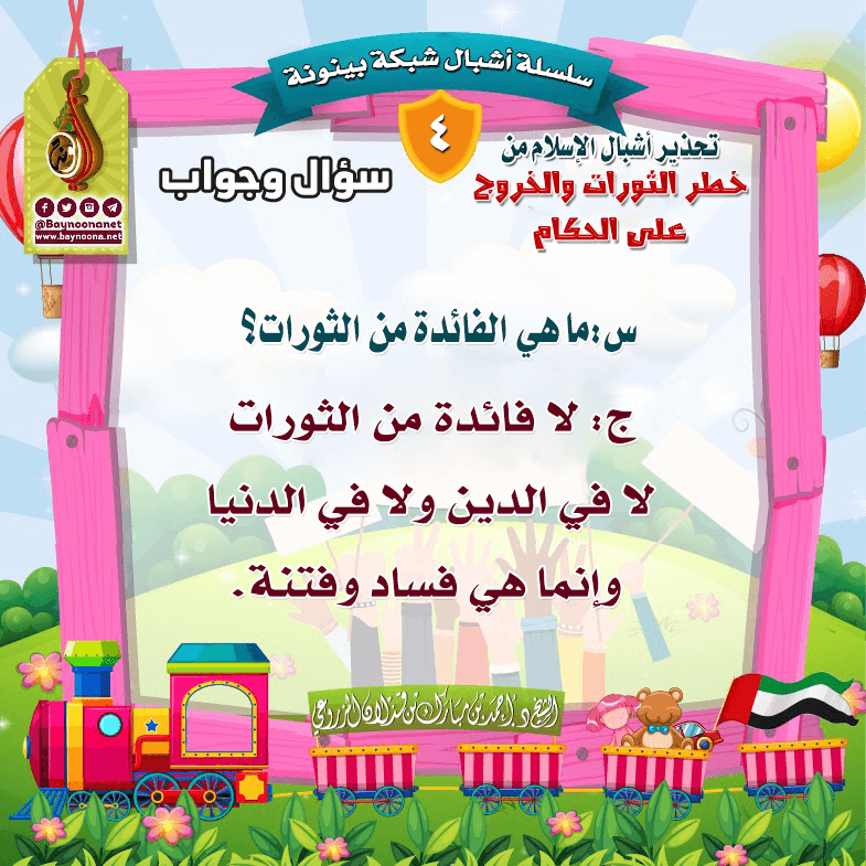 تحذير أشبال الإسلام من خطر الثورات والخروج على الحكام (سؤال وجواب) - (٤) ماهي الفائدة من الثورات ؟ تاريخ الإضافة: الأحد, 15/12/2019 - 14:54 التصنيفات صنف البطاقة: إيمانيات الشيخ: د. أحمد بن مبارك المزروعي سلسلة بطاقات: تحذير أشبال الإسلام من خطر الثورات والخروج على الحكام (سؤال وجواب) حمل السلسلة كاملة: تحذير أشبال الإسلام من خطر الثورات والخروج على الحكام (سؤال وجواب)