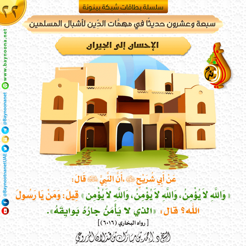 سبعة وعشرون حديثا في مهمات الدين لأشبال المسلمين - (٢٢) الإحسان إلى الجيران تاريخ الإضافة: الإثنين, 16/12/2019 - 12:37 التصنيفات صنف البطاقة: الأخلاق والآداب الشيخ: د. أحمد بن مبارك المزروعي سلسلة بطاقات: سبعة وعشرون حديثا في مهمات الدين لأشبال المسلمين حمل السلسلة كاملة: سبعة وعشرون حديثا في مهمات الدين لأشبال المسلمين