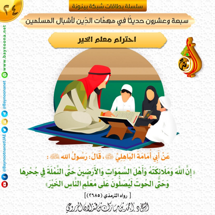 سبعة وعشرون حديثا في مهمات الدين لأشبال المسلمين - (٢٤) احترام معلم الخير تاريخ الإضافة: الأربعاء, 18/12/2019 - 12:37 التصنيفات صنف البطاقة: الأخلاق والآداب الشيخ: د. أحمد بن مبارك المزروعي سلسلة بطاقات: سبعة وعشرون حديثا في مهمات الدين لأشبال المسلمين حمل السلسلة كاملة: سبعة وعشرون حديثا في مهمات الدين لأشبال المسلمين